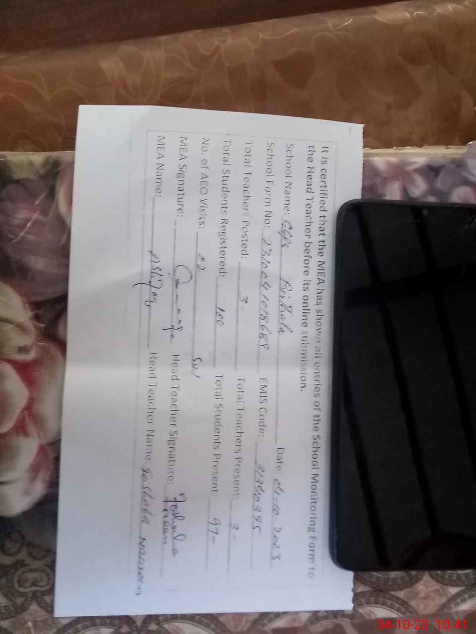| Name: No**** No**** Designation: (School Headmaster's/Headmistress's) EST Phone/Cell Number: 03**** |