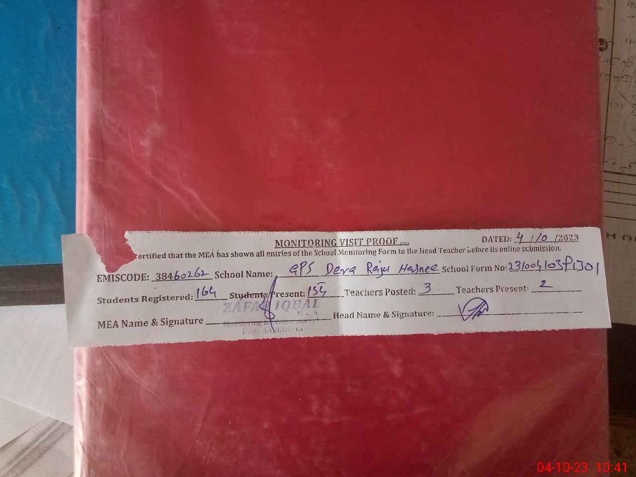 | Attendance Register | Head Teacher | MEA with School | Visit Proof |