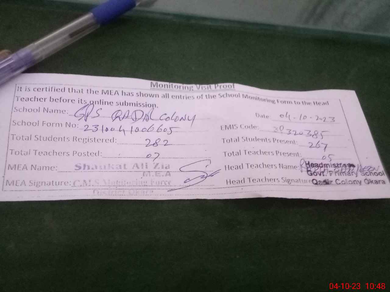 | Monitoring Date: 04-10-2023 | Start Time: 04-10-2023 10:06 AM | End Time: 04-10-2023 10:49 AM | Name of MEA: SH**** AL**** ZI**** (R**** | |