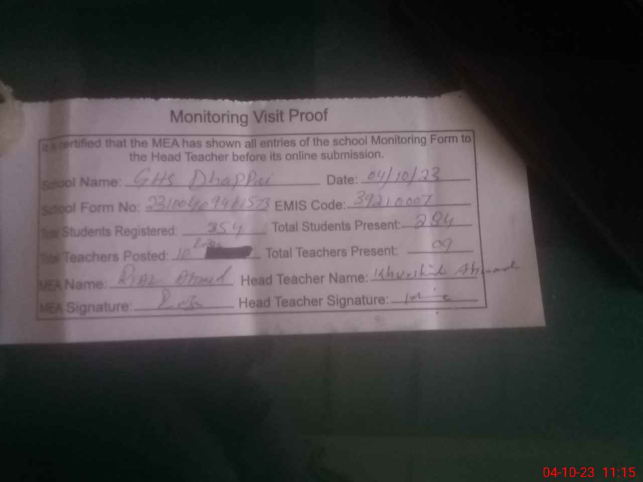 | Attendance Register | Head Teacher | MEA with School | Visit Proof |