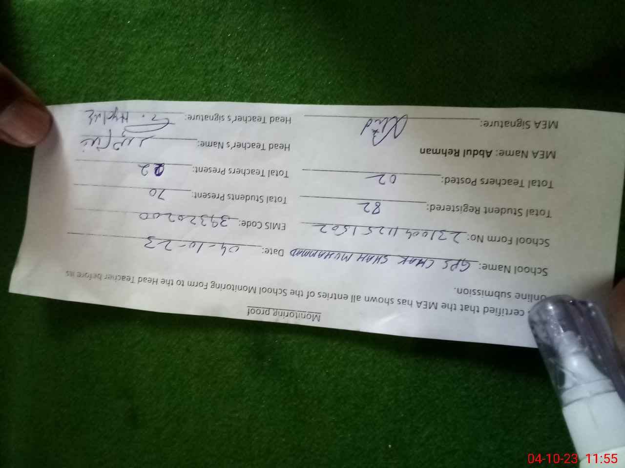 | Attendance Register | Head Teacher | MEA with School | Visit Proof |