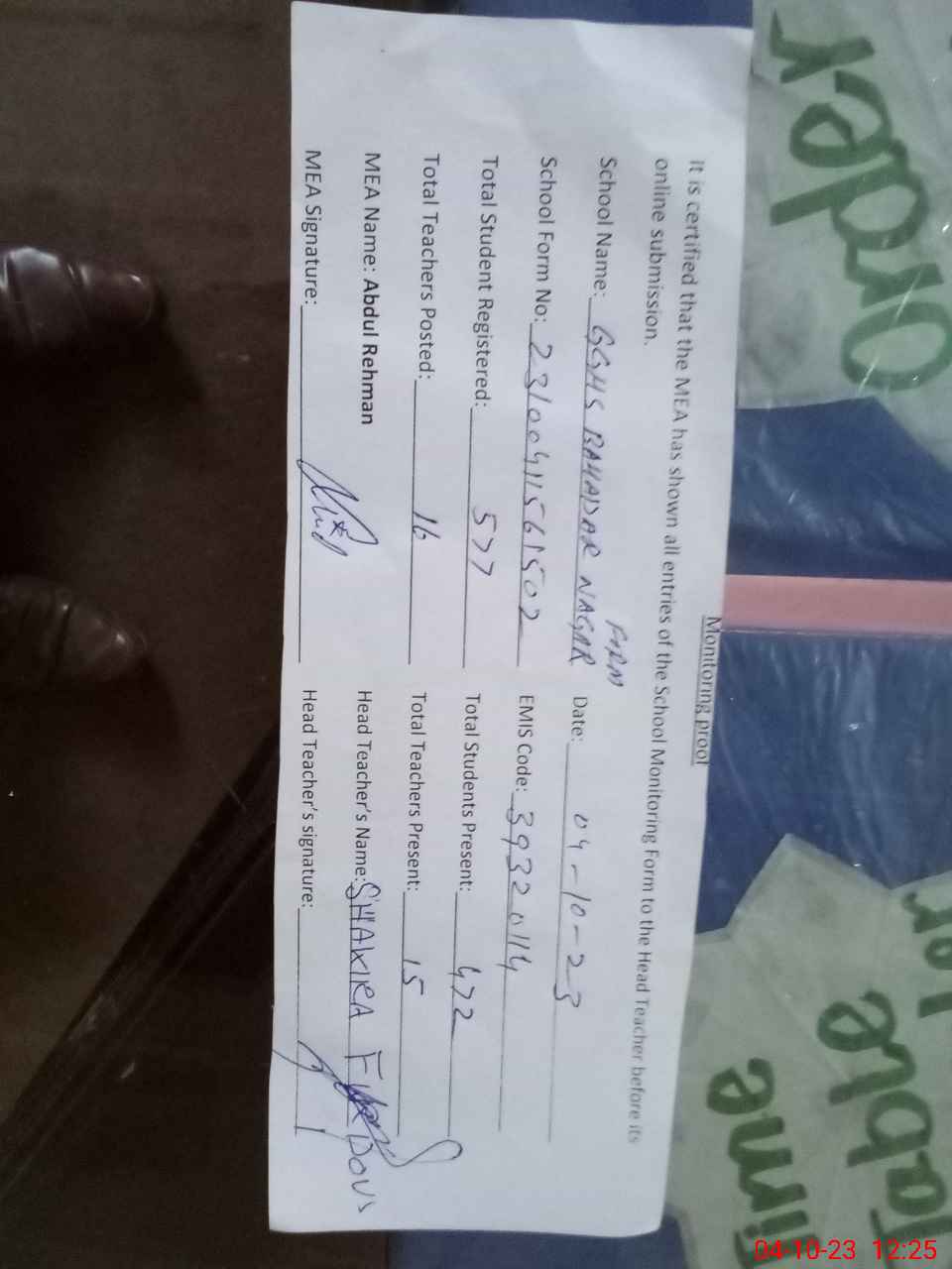 | Attendance Register | Head Teacher | MEA with School | Visit Proof |