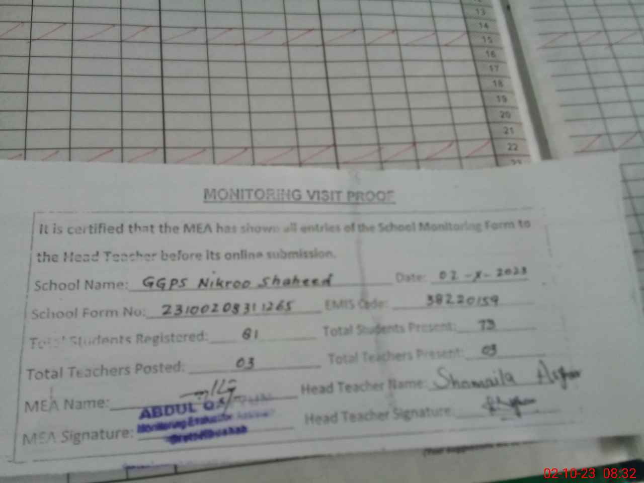 | Attendance Register | Head Teacher | MEA with School | Visit Proof |