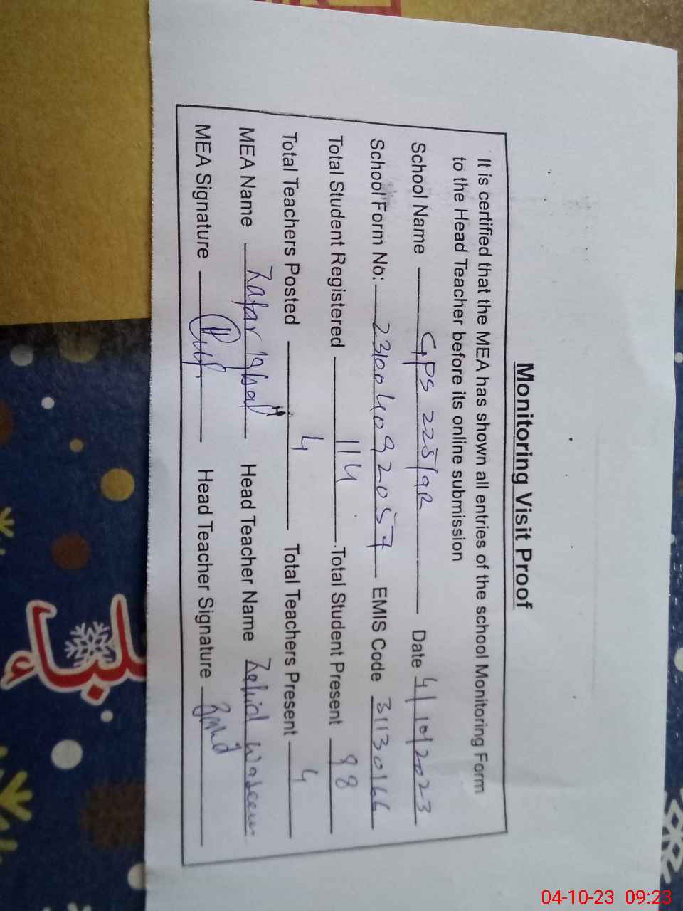 | Monitoring Date: 04-10-2023 | Start Time: 04-10-2023 09:11 AM | End Time: 04-10-2023 09:23 AM | Name of MEA: Za**** Iq**** BN**** | |