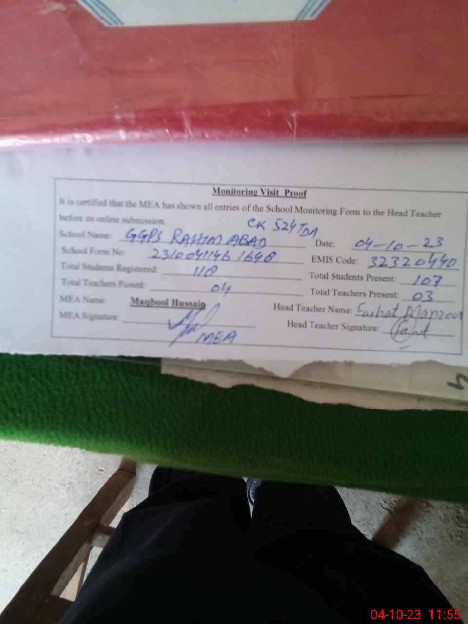 | Attendance Register | Head Teacher | MEA with School | Visit Proof |