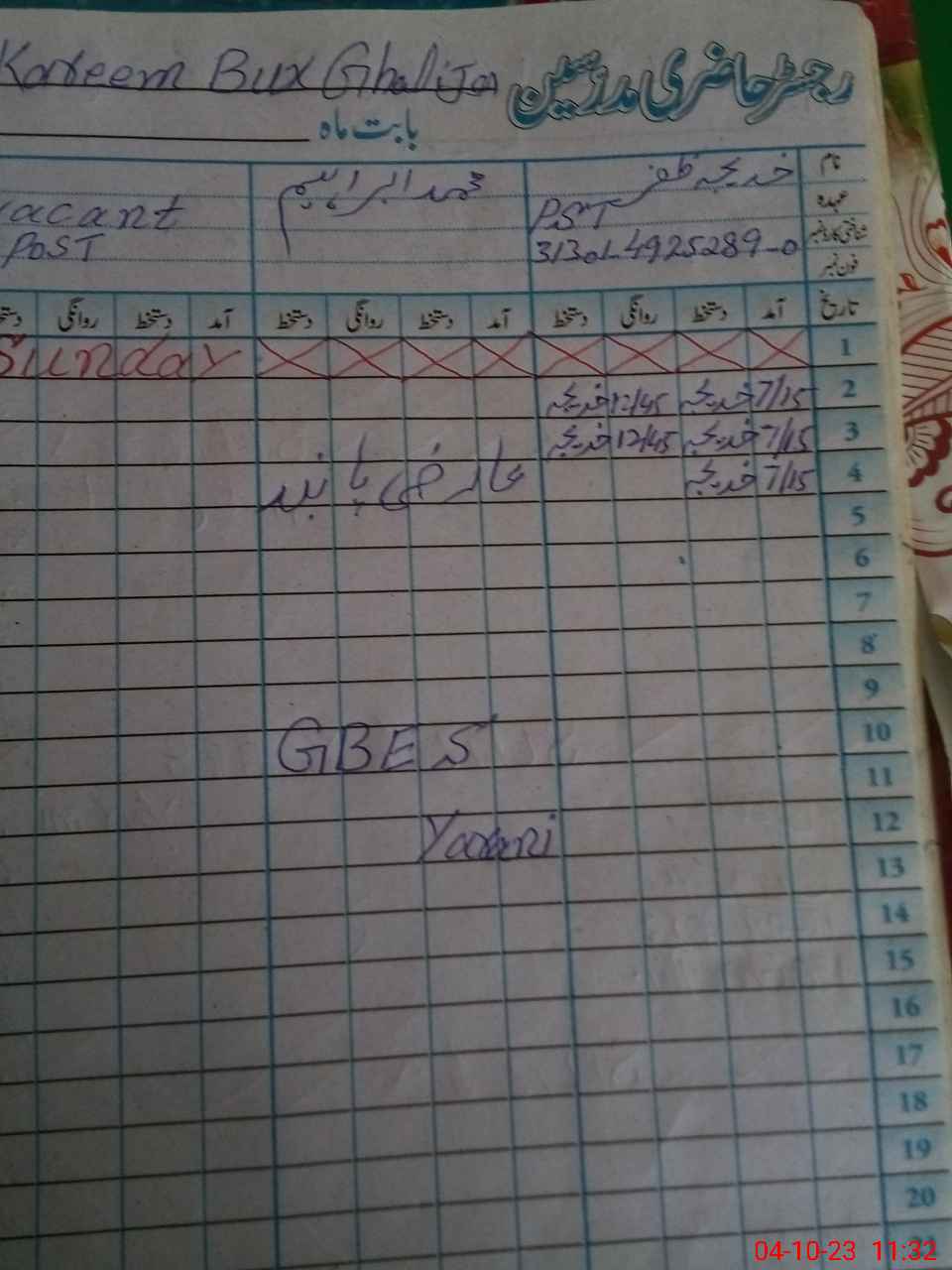 | Name: Kh**** Za**** Designation: (School Headmaster's/Headmistress's) PST Phone/Cell Number: 03**** |
