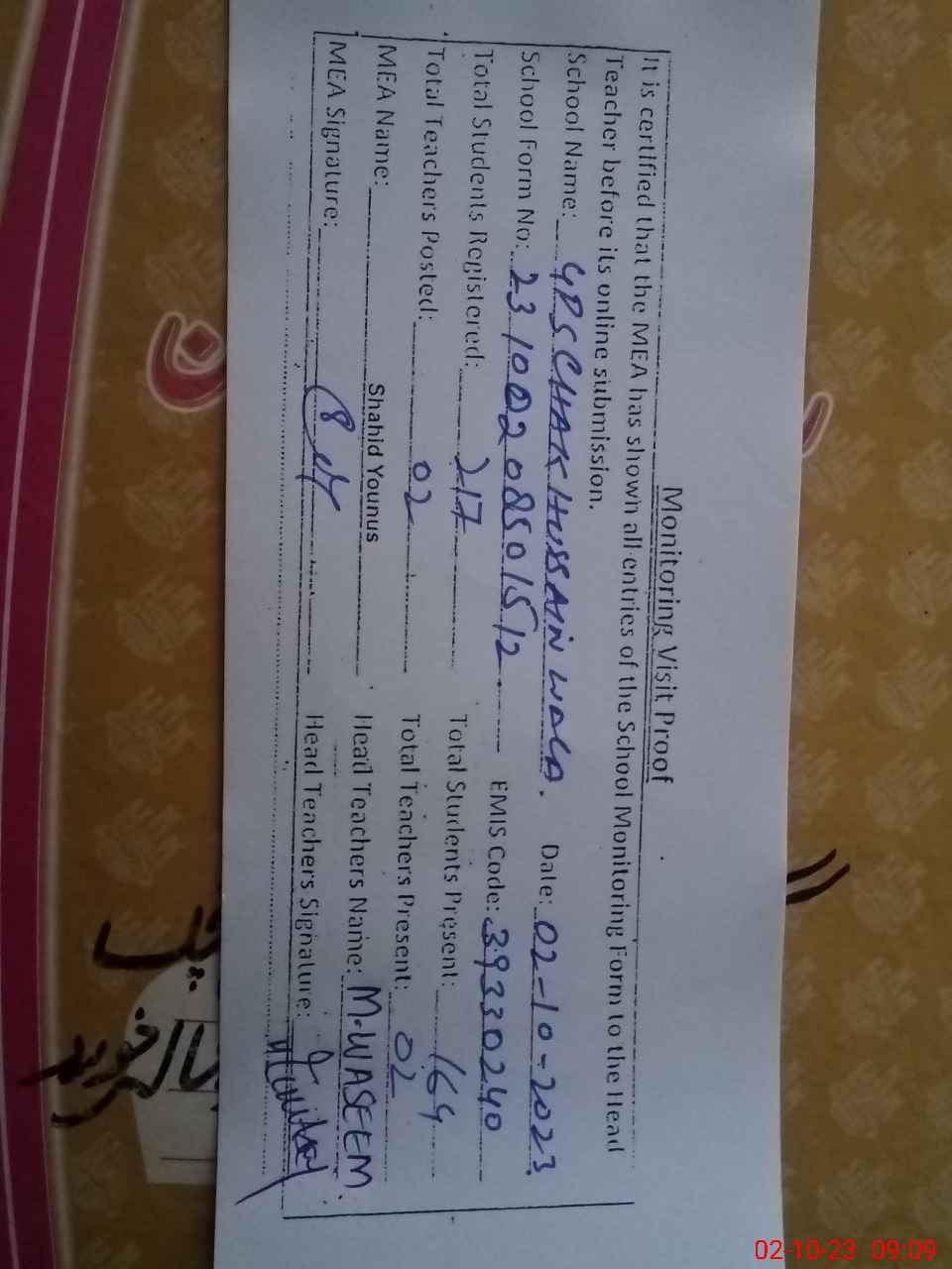 | EMIS Code: 39330240 | Name of School: GPS CHAK HUSSAIN ALI SHAH | |||