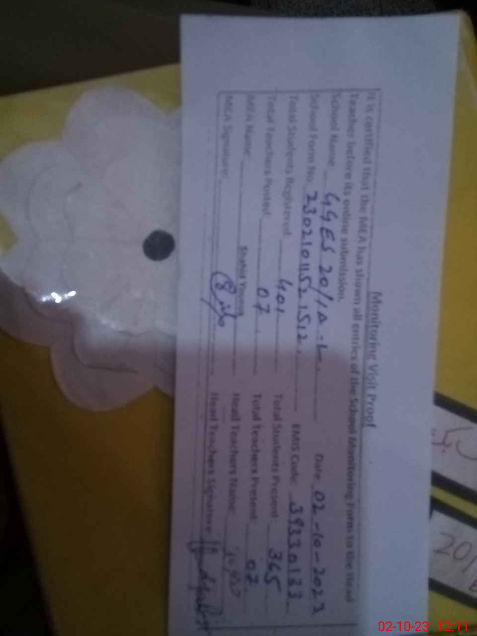 | Attendance Register | Head Teacher | MEA with School | Visit Proof |