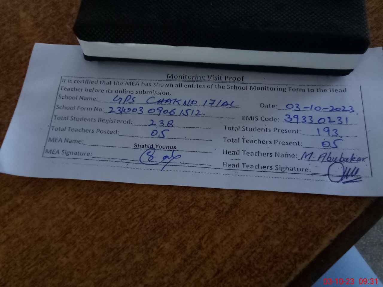 | Attendance Register | Head Teacher | MEA with School | Visit Proof |