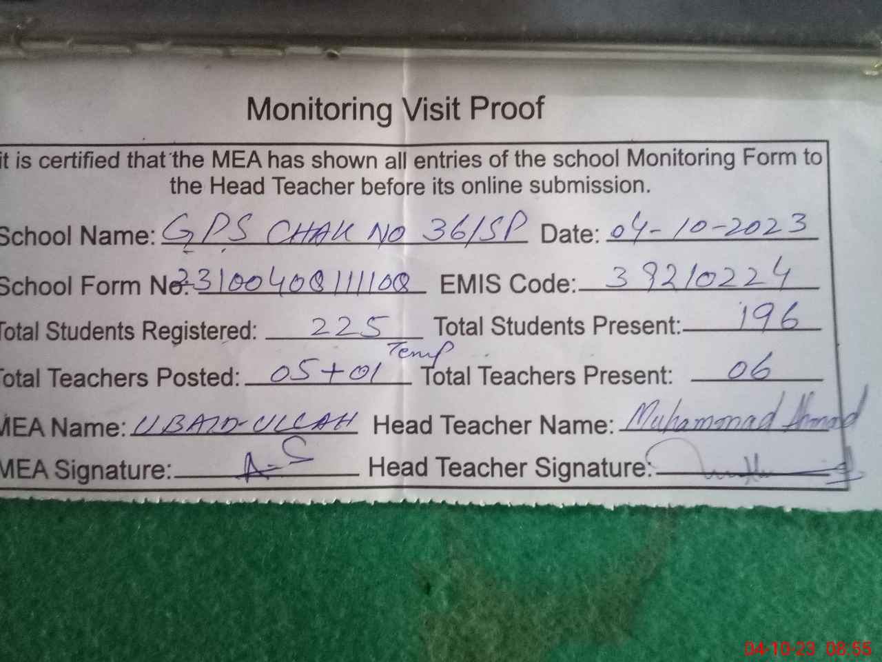 | EMIS Code: 39210224 | Name of School: GPS CHAK NO. 36 SP KALAN | |||