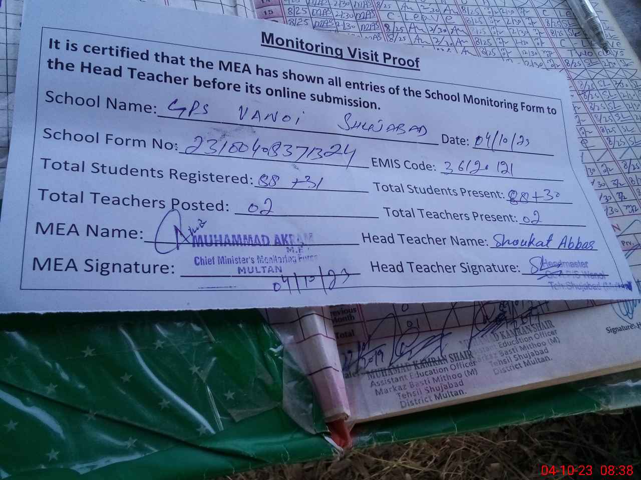 | Attendance Register | Head Teacher | MEA with School | Visit Proof |