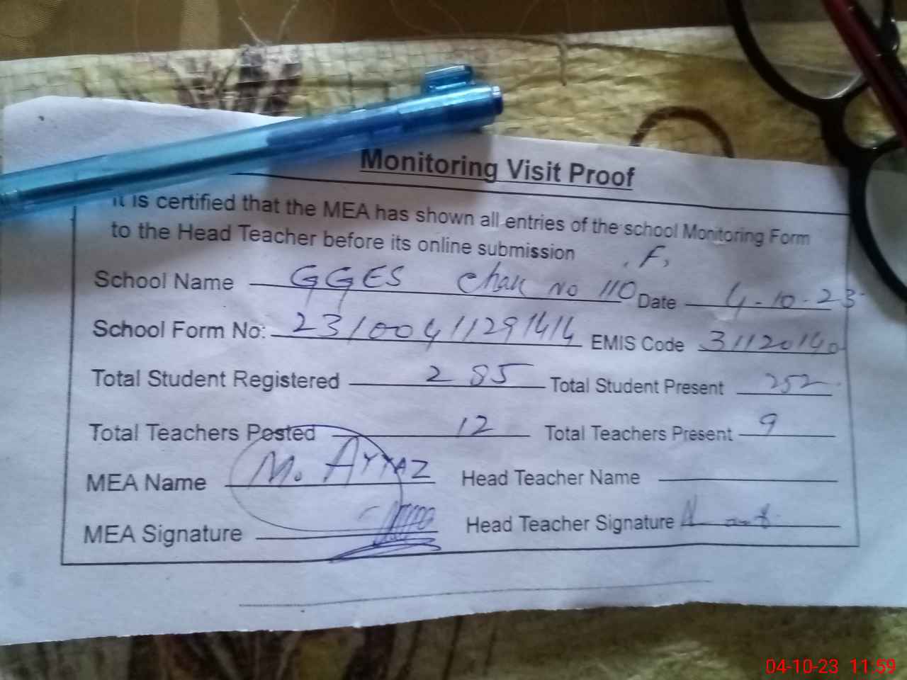 | Attendance Register | Head Teacher | MEA with School | Visit Proof |