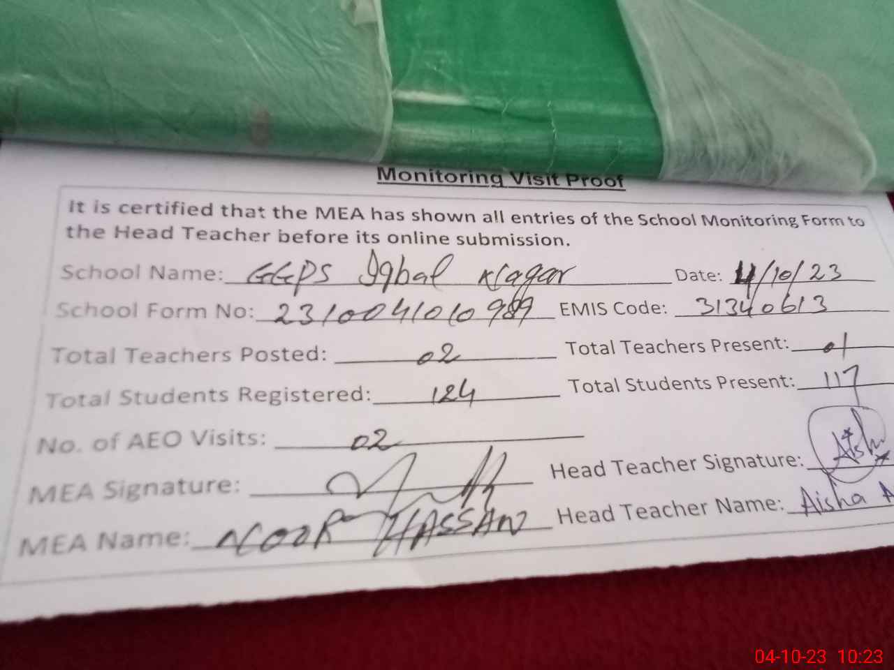 | EMIS Code: 31340613 | Name of School: GGPS IQBAL NAGAR | |||
