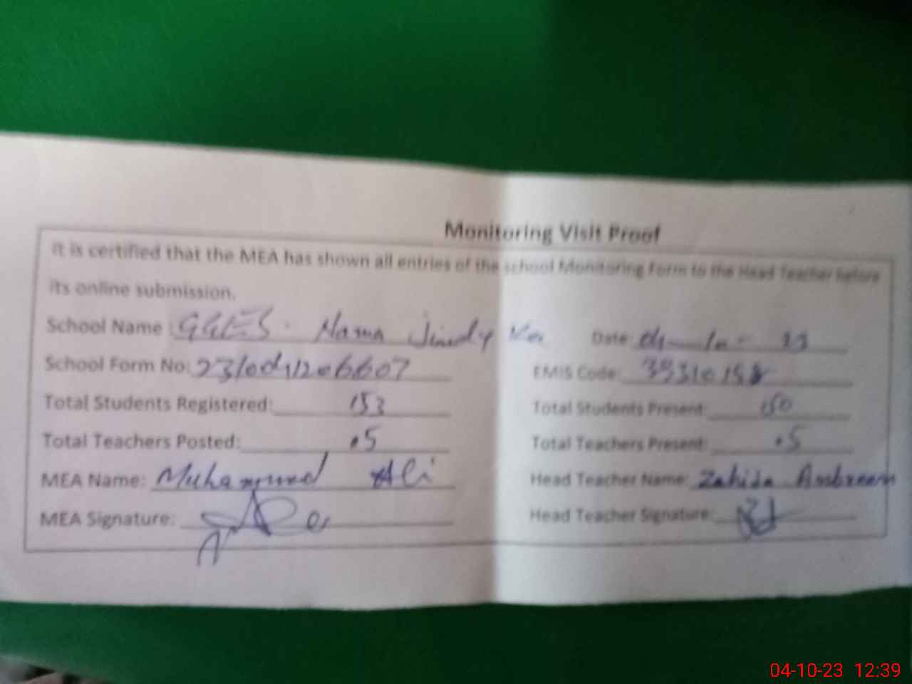 | Attendance Register | Head Teacher | MEA with School | Visit Proof |