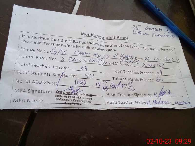 | EMIS Code: 31310158 | Name of School: GPS CHAK NO 43/P BASTI KHALIL | |||