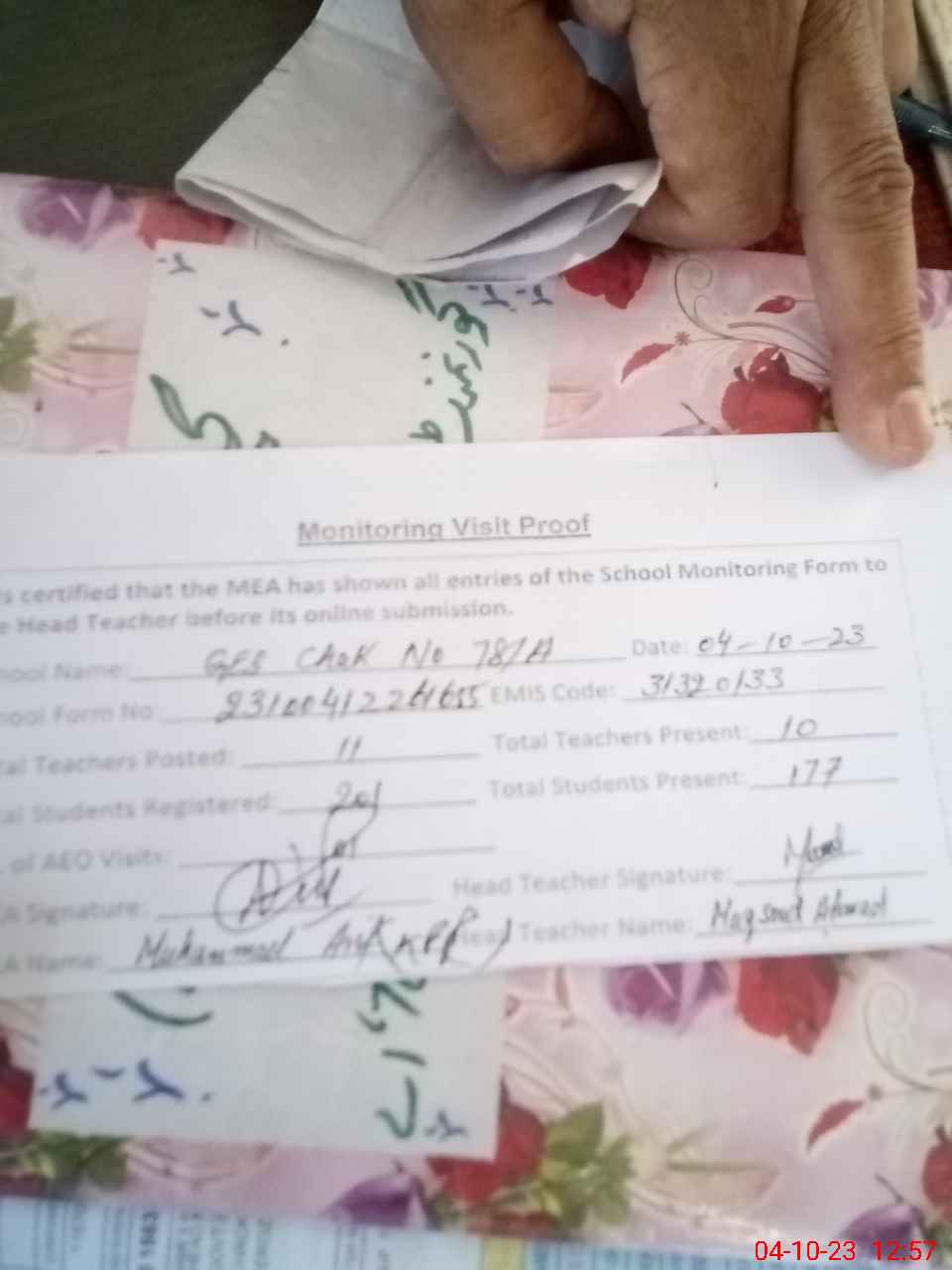 | Name: Ma**** Ah**** Designation: (School Headmaster's/Headmistress's) SST Phone/Cell Number: 03**** |