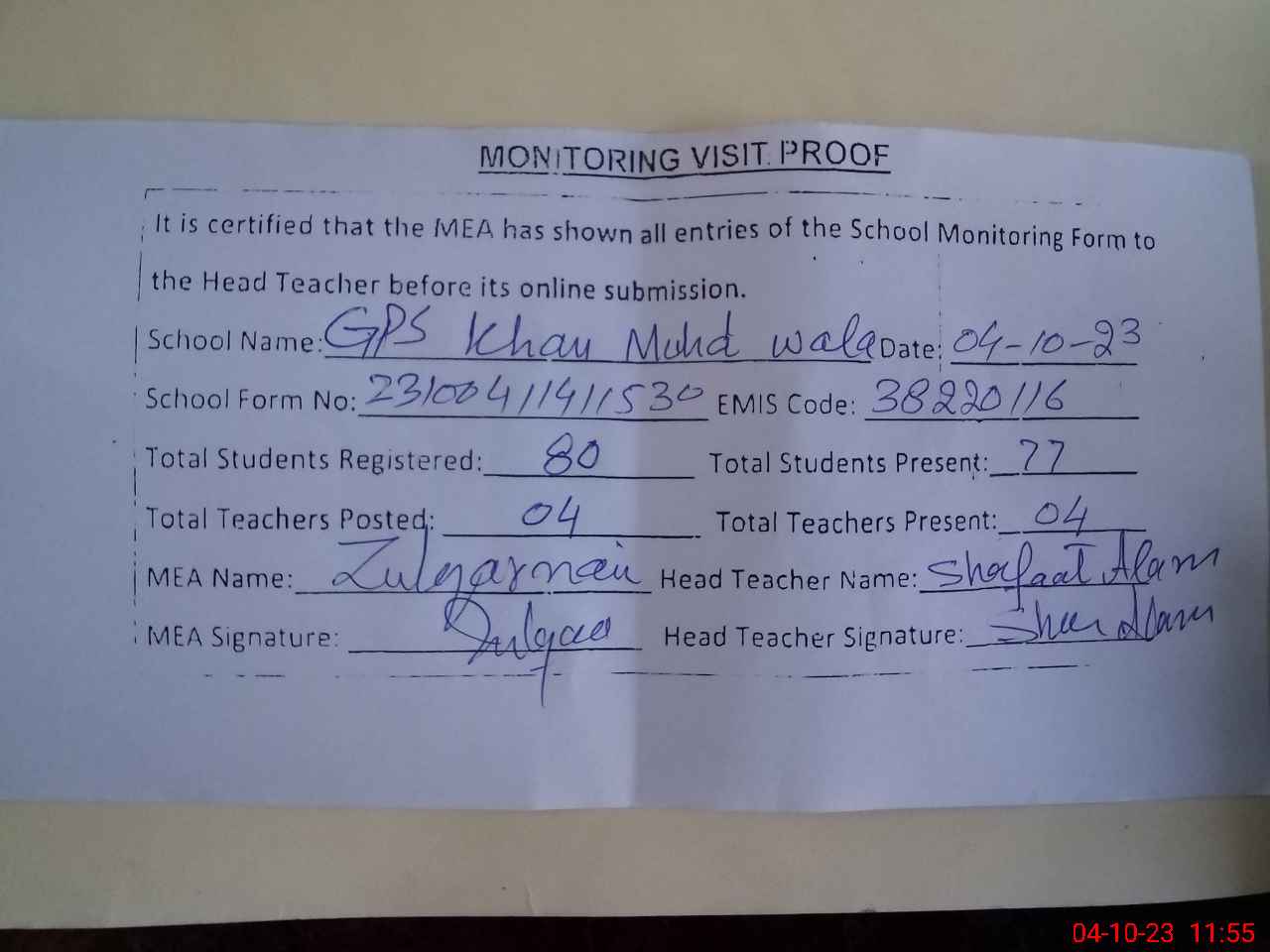 | Attendance Register | Head Teacher | MEA with School | Visit Proof |