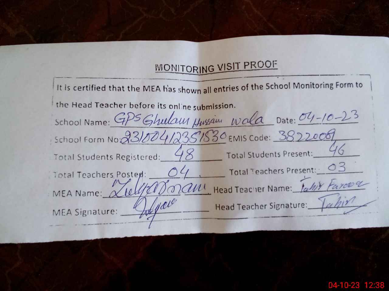 | EMIS Code: 38220009 | Name of School: GPS GHULAM HUSSAIN WALA | |||
