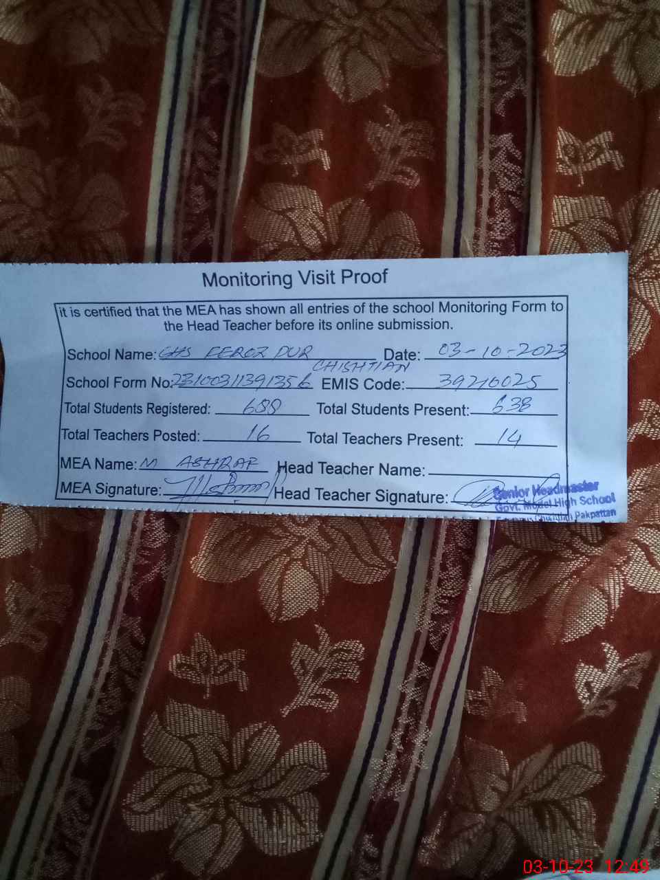 | EMIS Code: 39210025 | Name of School: GHS FEROZPUR CHISHTIAN | |||