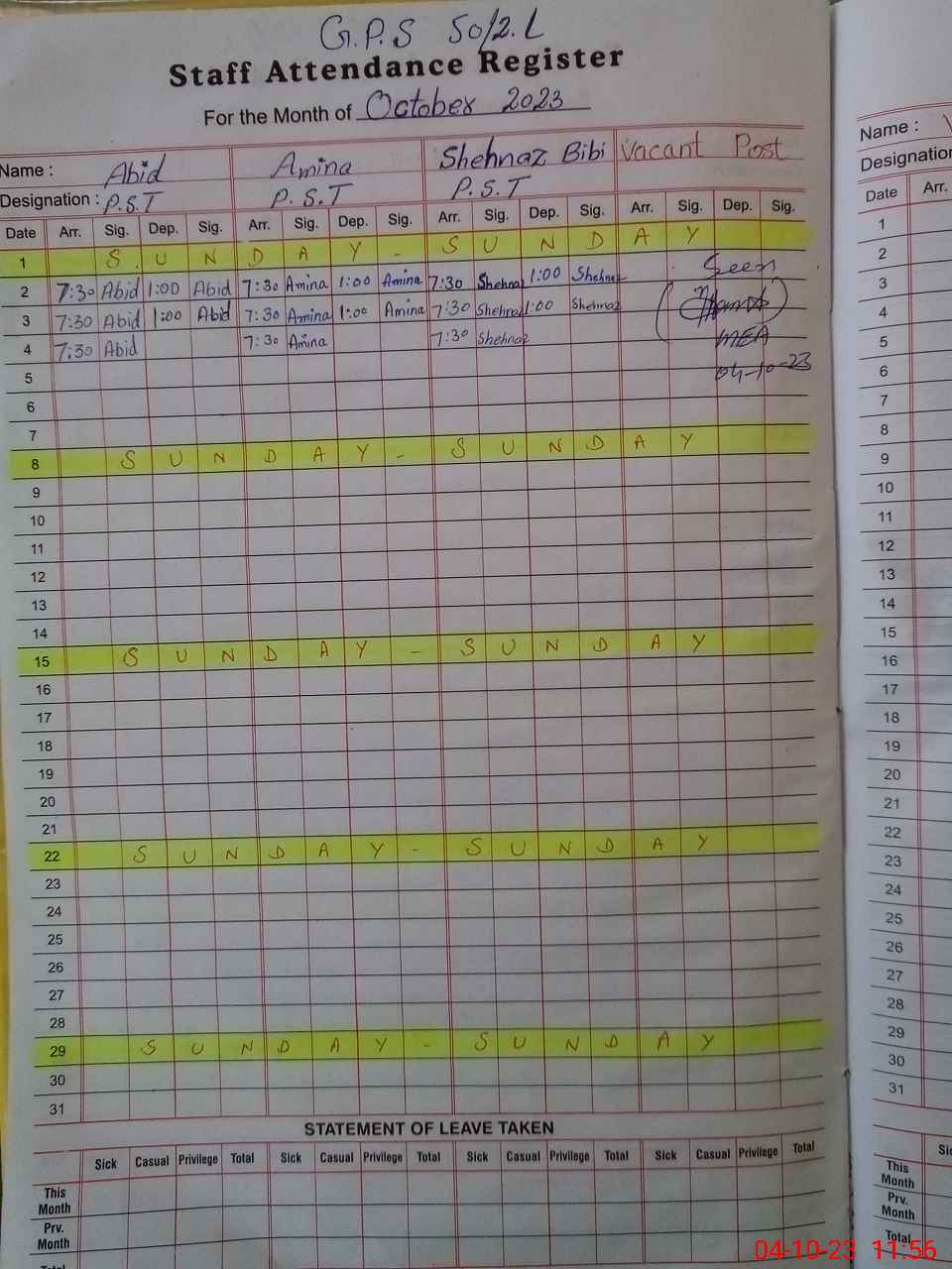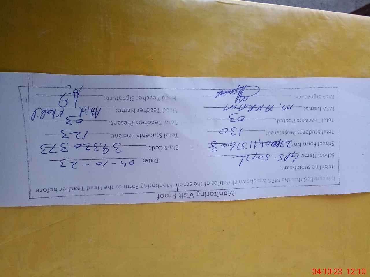 | Attendance Register | Head Teacher | MEA with School | Visit Proof |