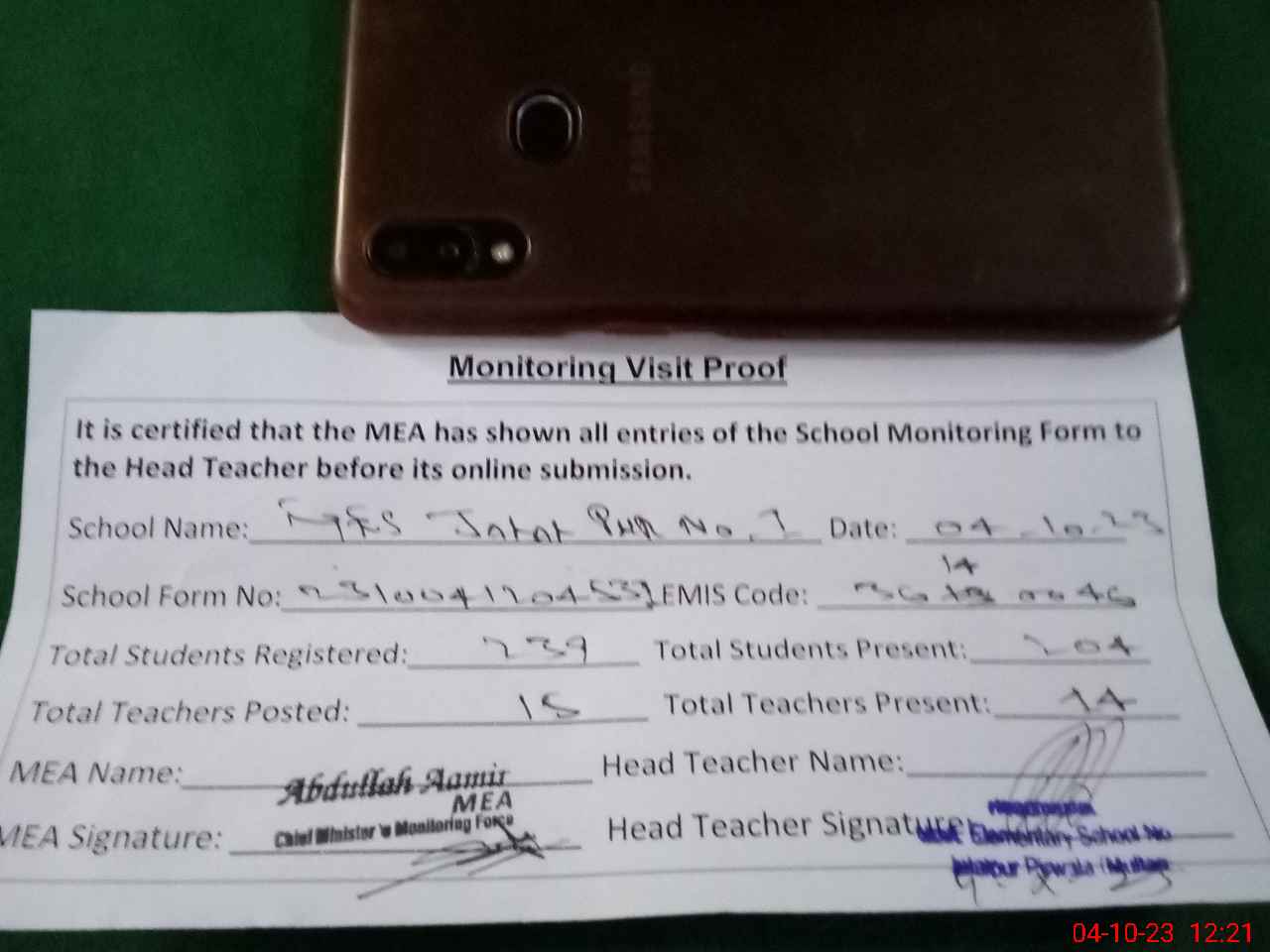| Attendance Register | Head Teacher | MEA with School | Visit Proof |