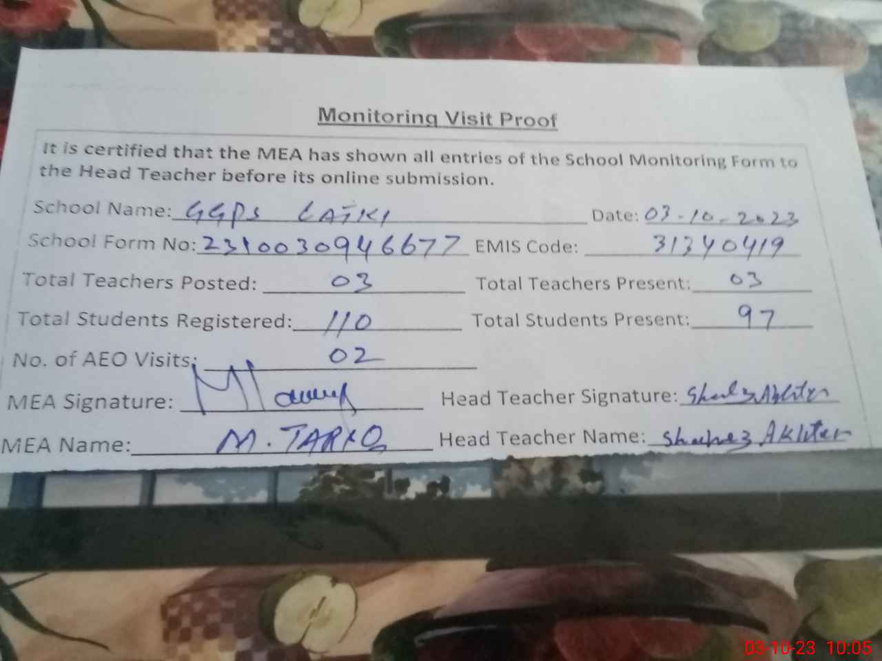 | Monitoring Date: 03-10-2023 | Start Time: 03-10-2023 09:46 AM | End Time: 03-10-2023 10:05 AM | Name of MEA: Mu**** Ta**** | |
