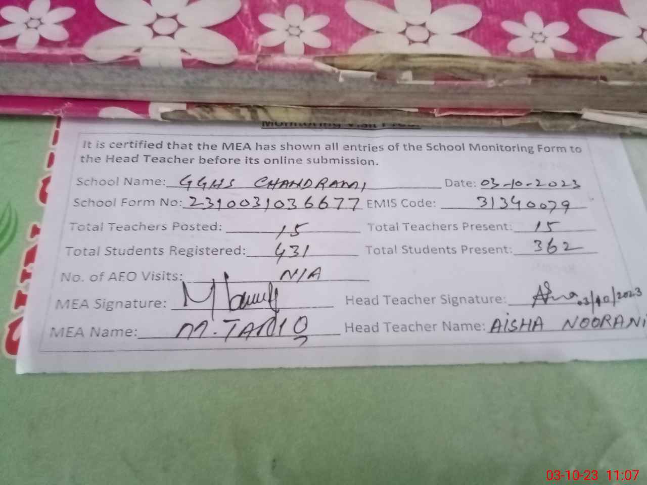| Certified that this School was Inspected by the Undersigned MEA/DMO Today and the Information Stated Above is as Per Record. | |||||