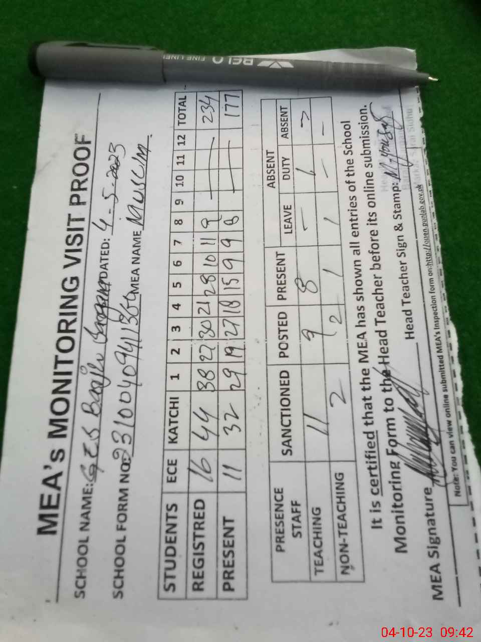 | Attendance Register | Head Teacher | MEA with School | Visit Proof |