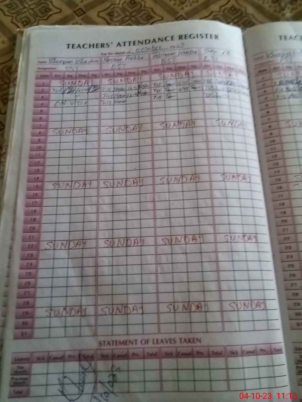 | Leave | Duty | Absent | Maternity | Medical | Ex- Pak |