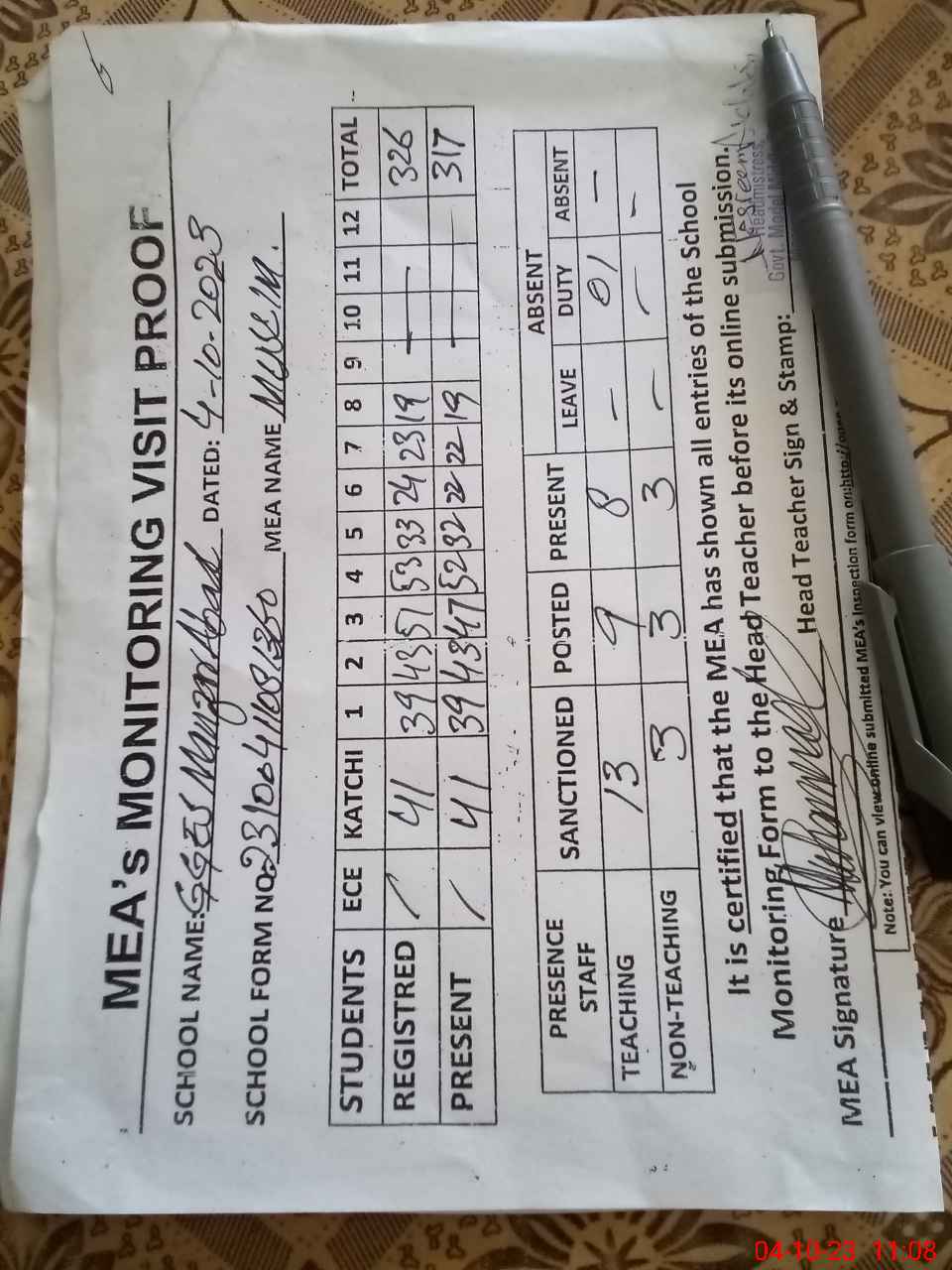 | Attendance Register | Head Teacher | MEA with School | Visit Proof |