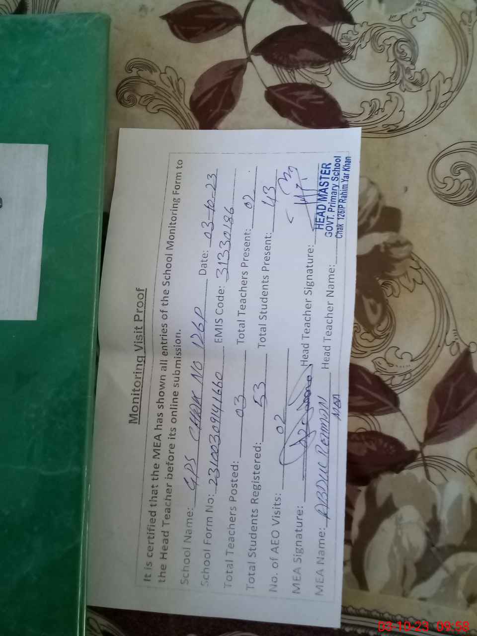| Attendance Register | Head Teacher | MEA with School | Visit Proof |