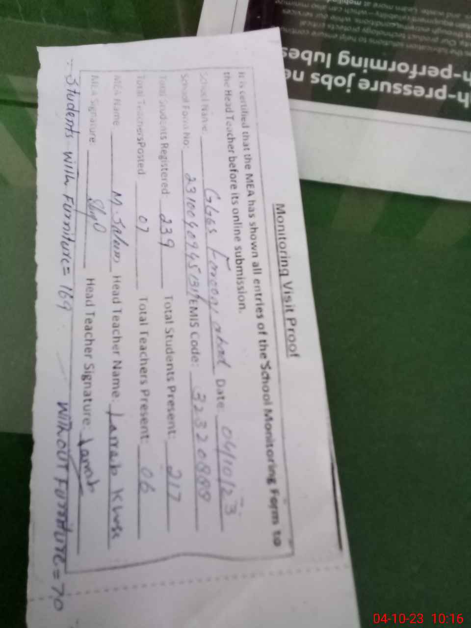 | Attendance Register | Head Teacher | MEA with School | Visit Proof |