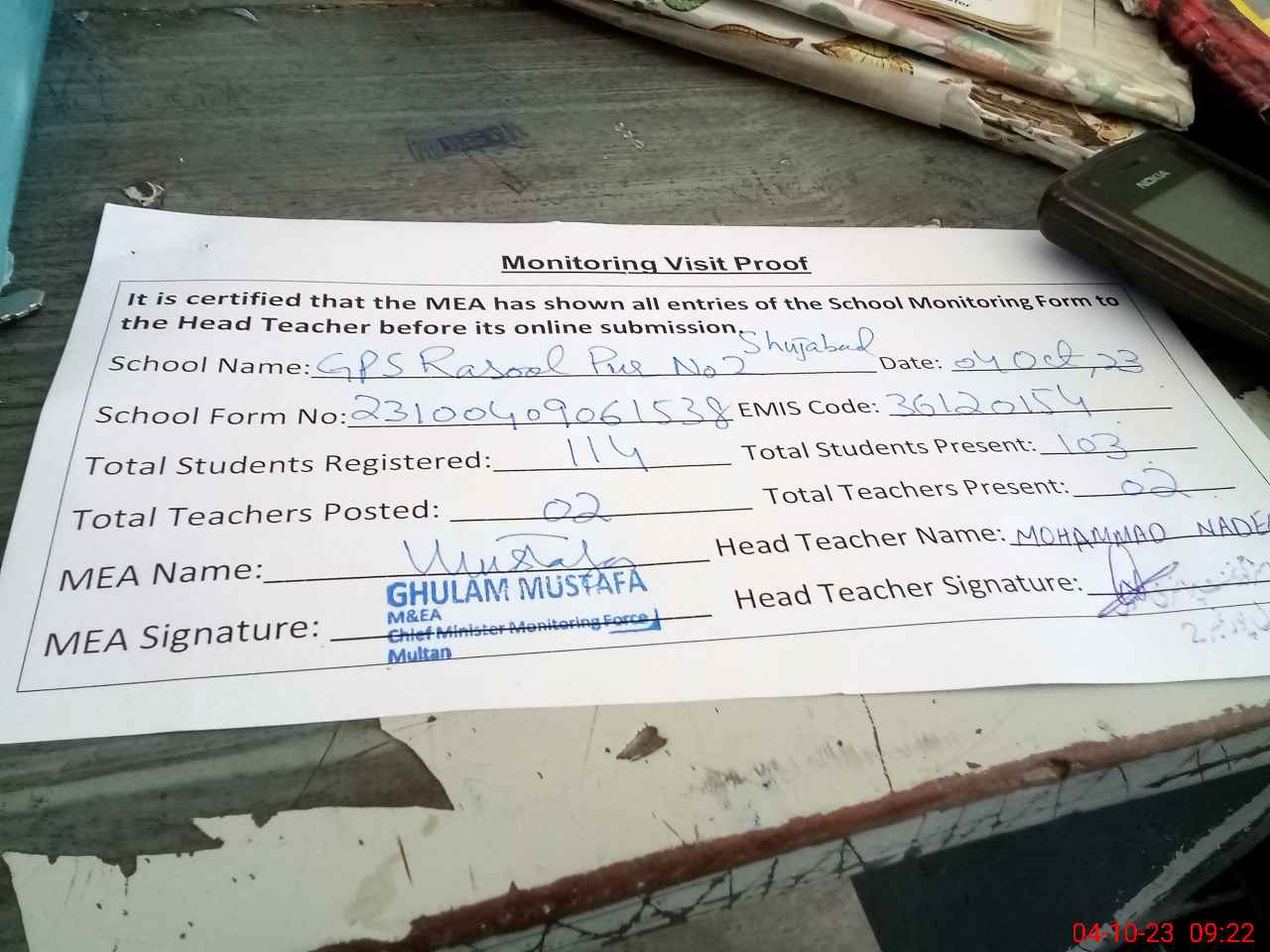 | Monitoring Date: 04-10-2023 | Start Time: 04-10-2023 08:49 AM | End Time: 04-10-2023 09:24 AM | Name of MEA: Gh**** Mu**** | |