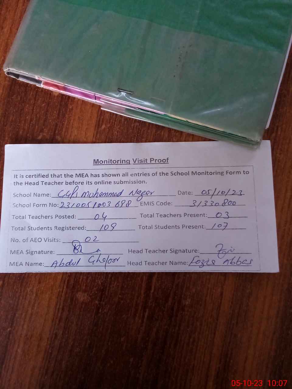 | Attendance Register | Head Teacher | MEA with School | Visit Proof |