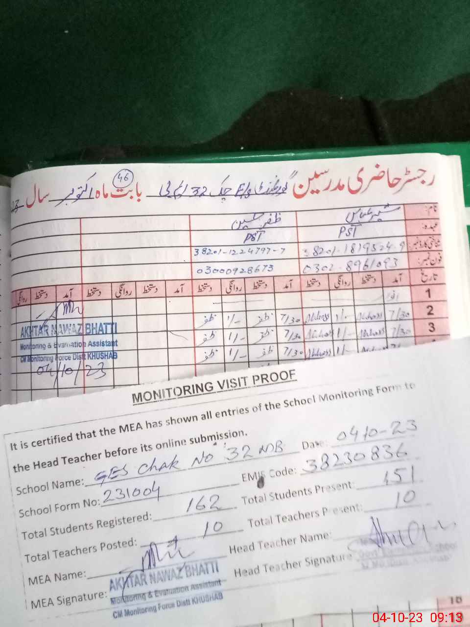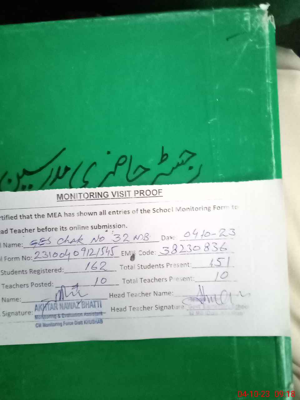 | Attendance Register | Head Teacher | MEA with School | Visit Proof |