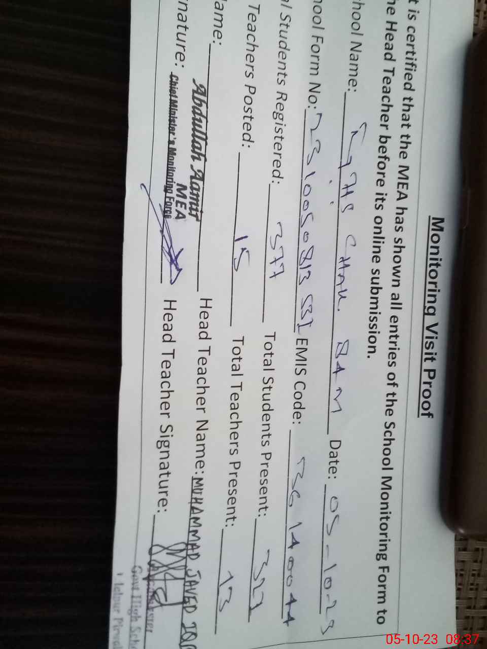 | Name: MU**** JA**** IQ**** Designation: (School Headmaster's/Headmistress's) HEAD MASTER Phone/Cell Number: 03**** |