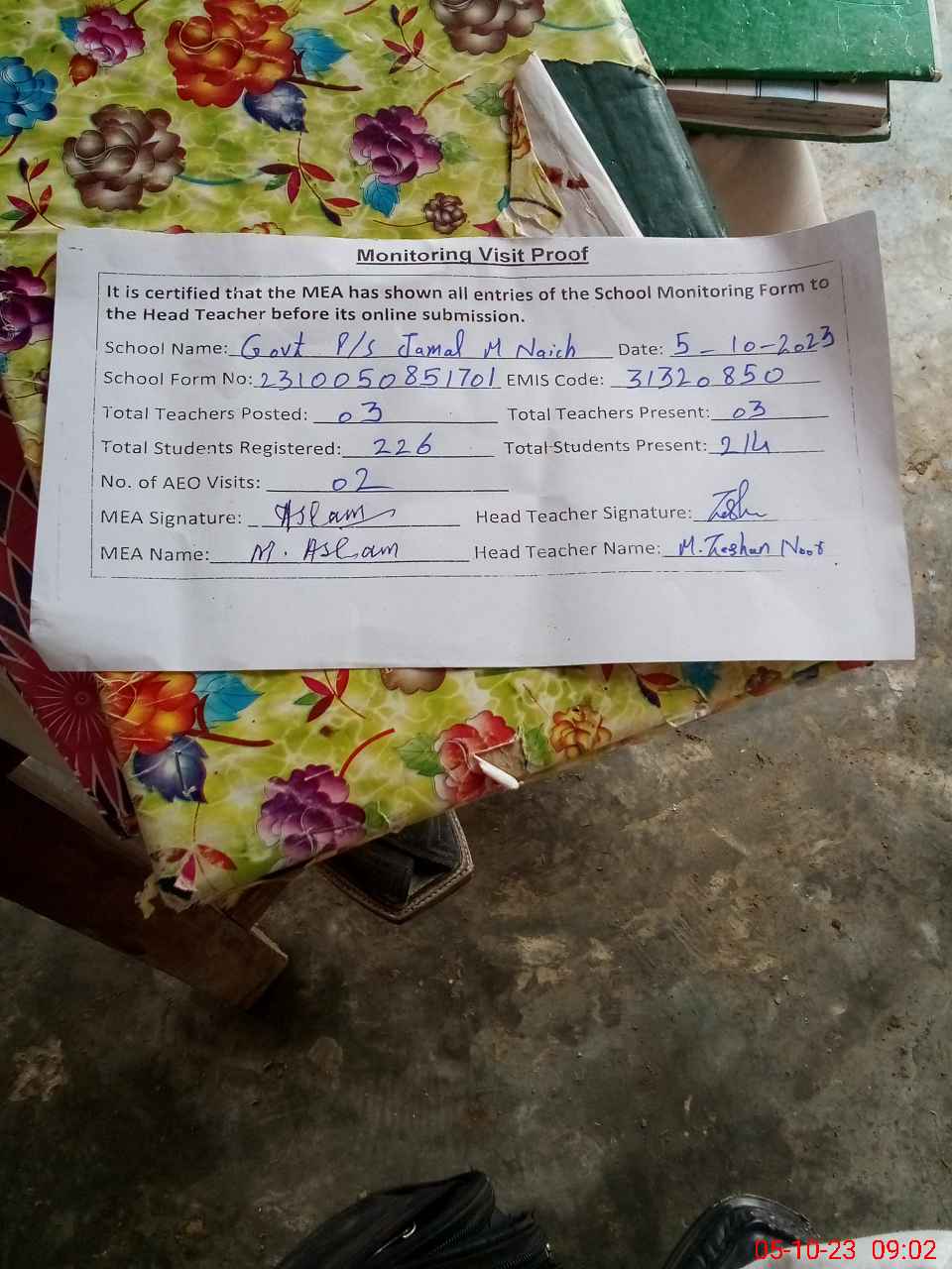 | EMIS Code: 31320850 | Name of School: GPS JAMAL MUHAMMAD NAICH | |||