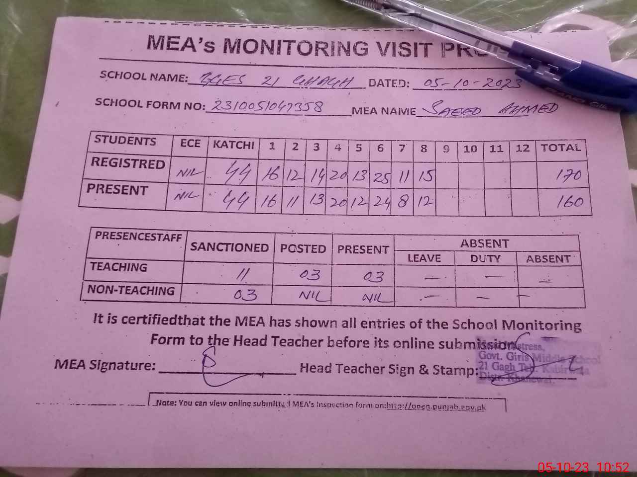 | Certified that this School was Inspected by the Undersigned MEA/DMO Today and the Information Stated Above is as Per Record. | |||||