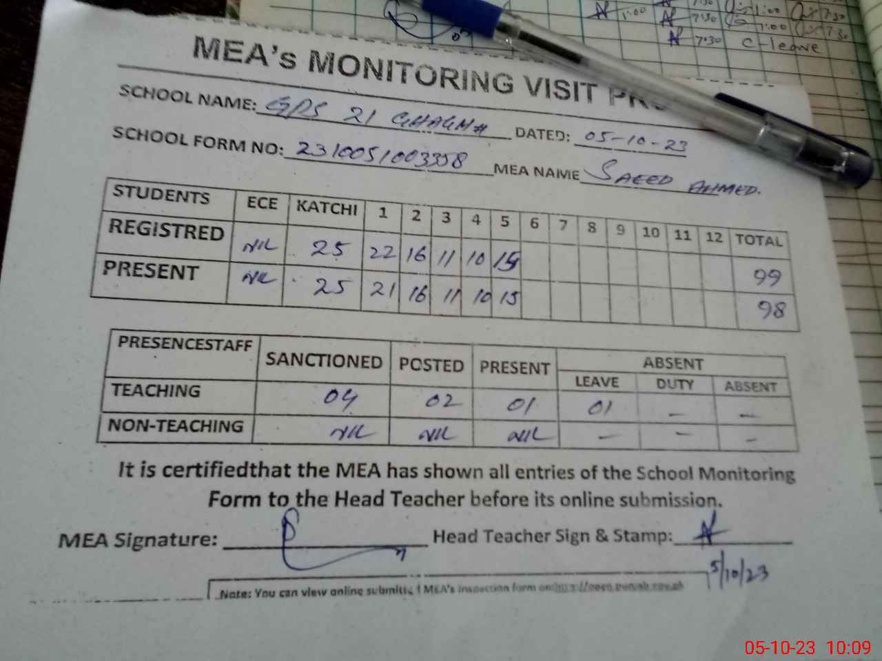 | Monitoring Date: 05-10-2023 | Start Time: 05-10-2023 09:48 AM | End Time: 05-10-2023 10:10 AM | Name of MEA: Sa**** Ah**** | |