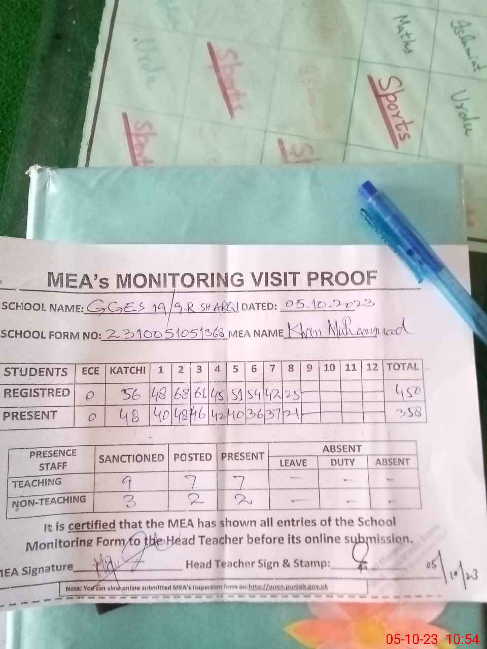 | Attendance Register | Head Teacher | MEA with School | Visit Proof |