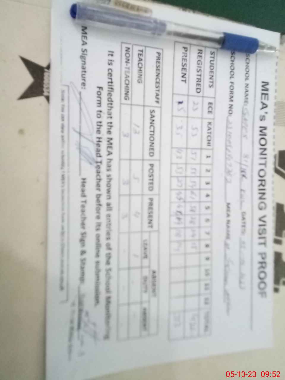 | Attendance Register | Head Teacher | MEA with School | Visit Proof |