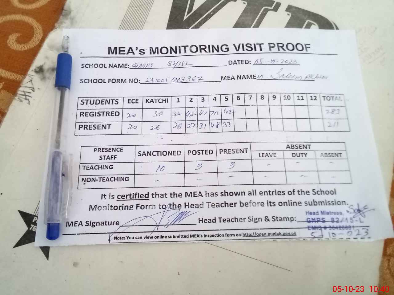 | EMIS Code: 36420681 | Name of School: GMPS CHAK NO. 82/15-L KACHA KHUH | |||