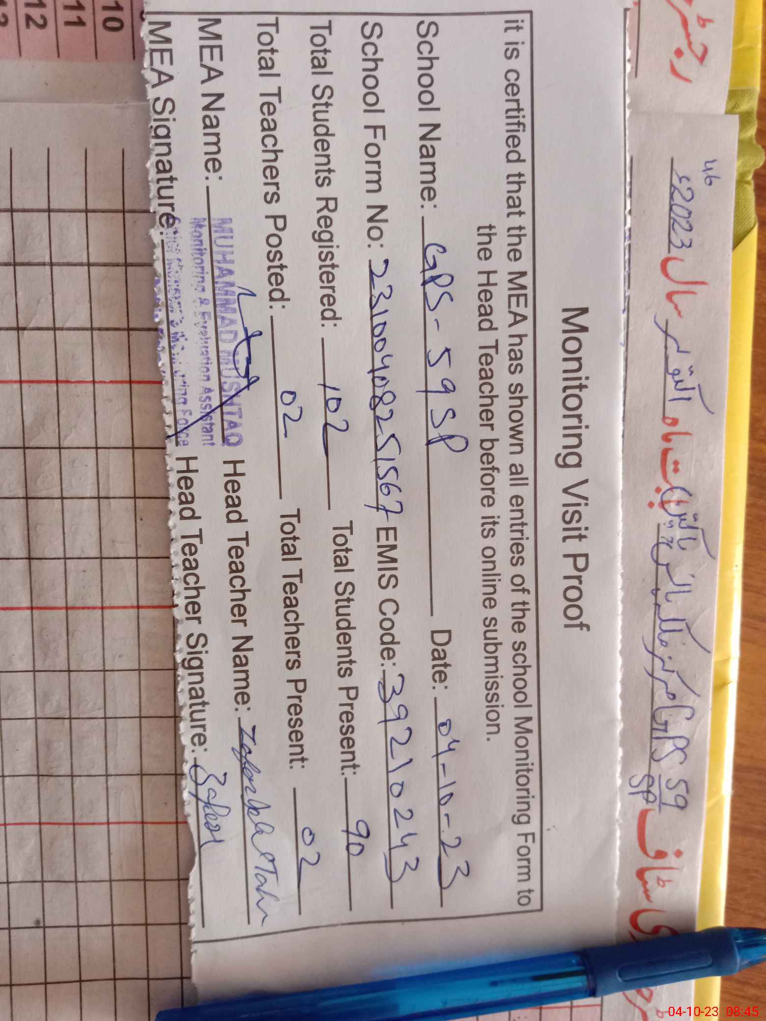 | Attendance Register | Head Teacher | MEA with School | Visit Proof |