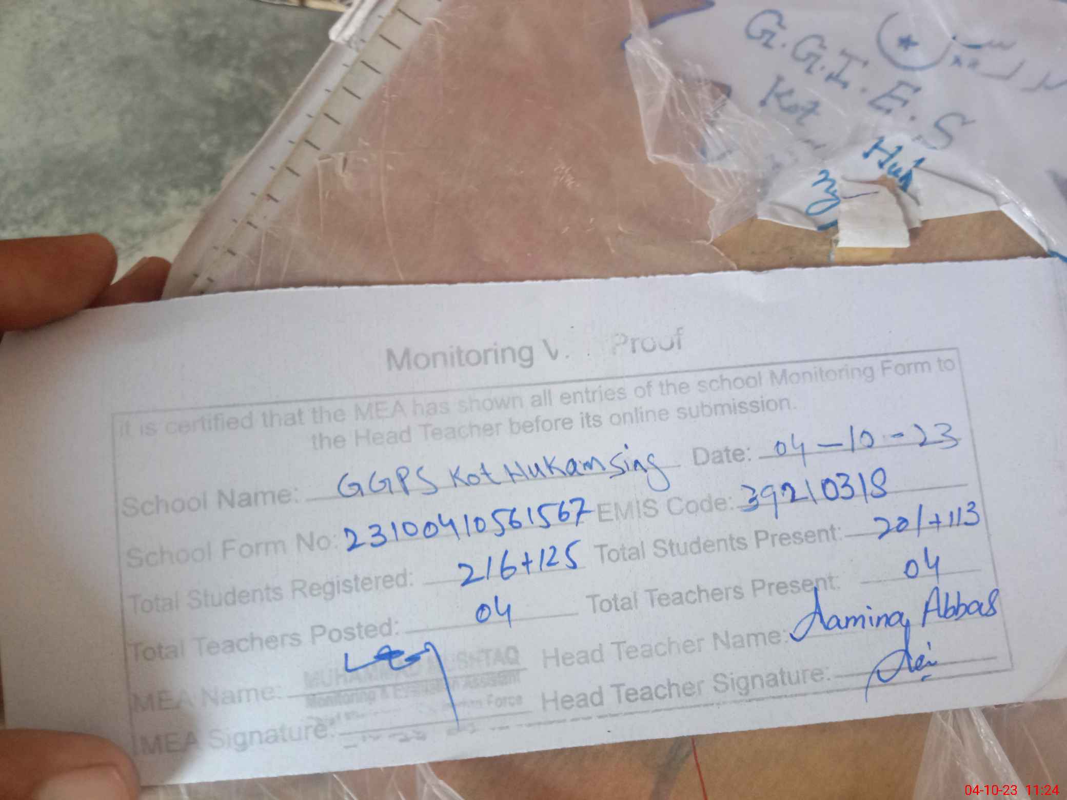 | EMIS Code: 39210318 | Name of School: GGPS KOT HUKAM SINGH | |||
