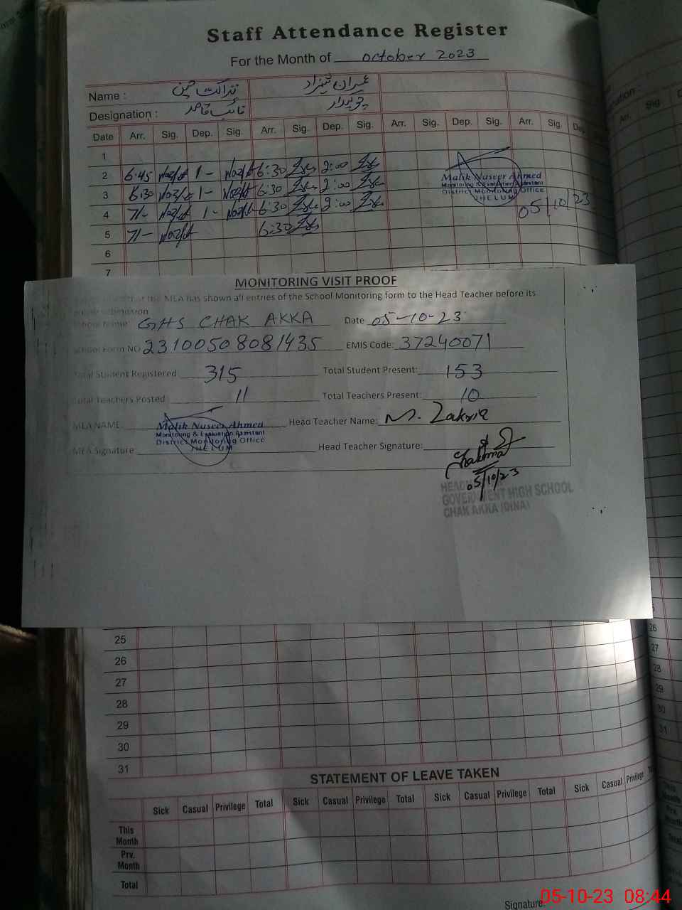 | Attendance Register | Head Teacher | MEA with School | Visit Proof |