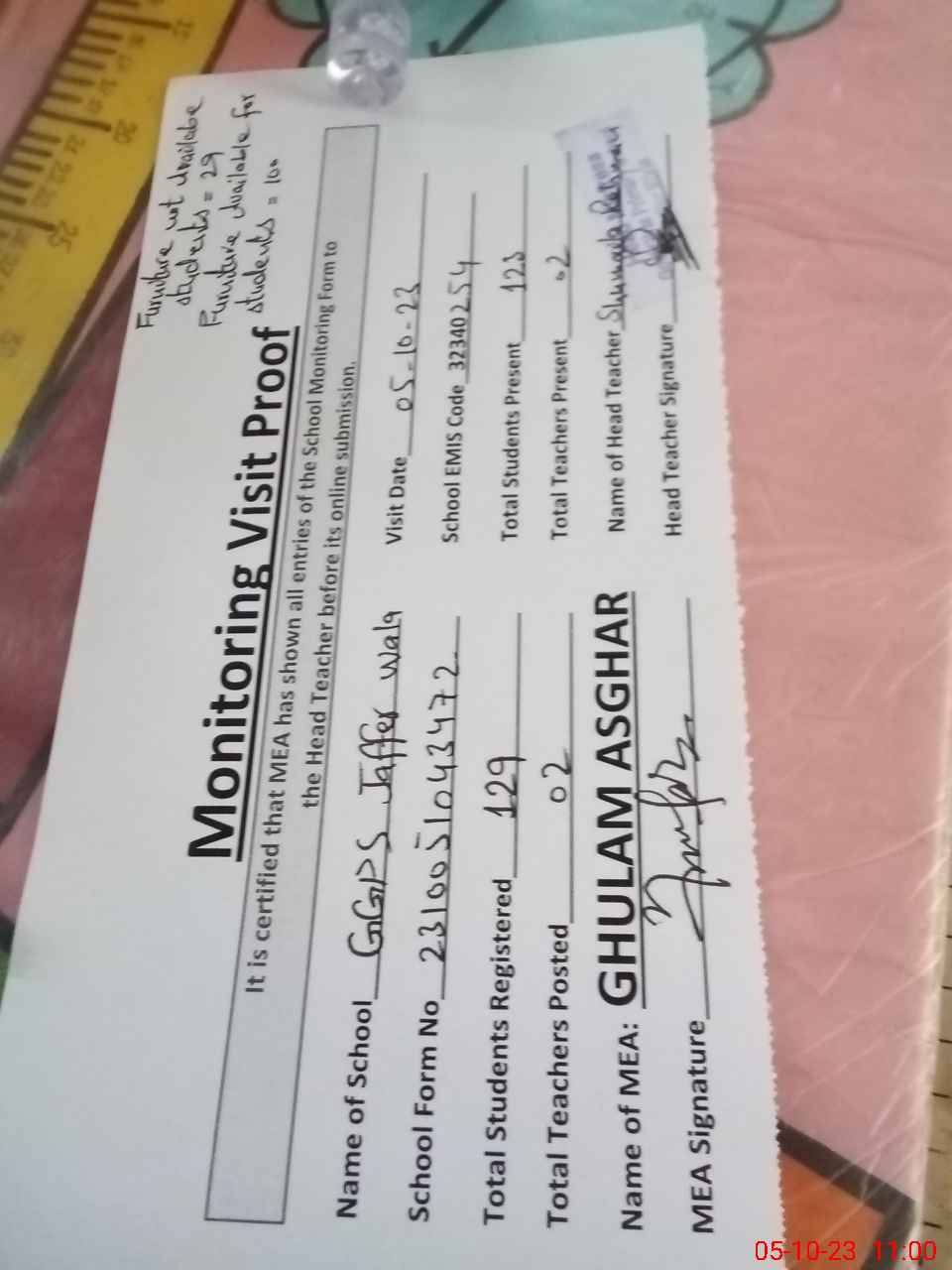 | Attendance Register | Head Teacher | MEA with School | Visit Proof |