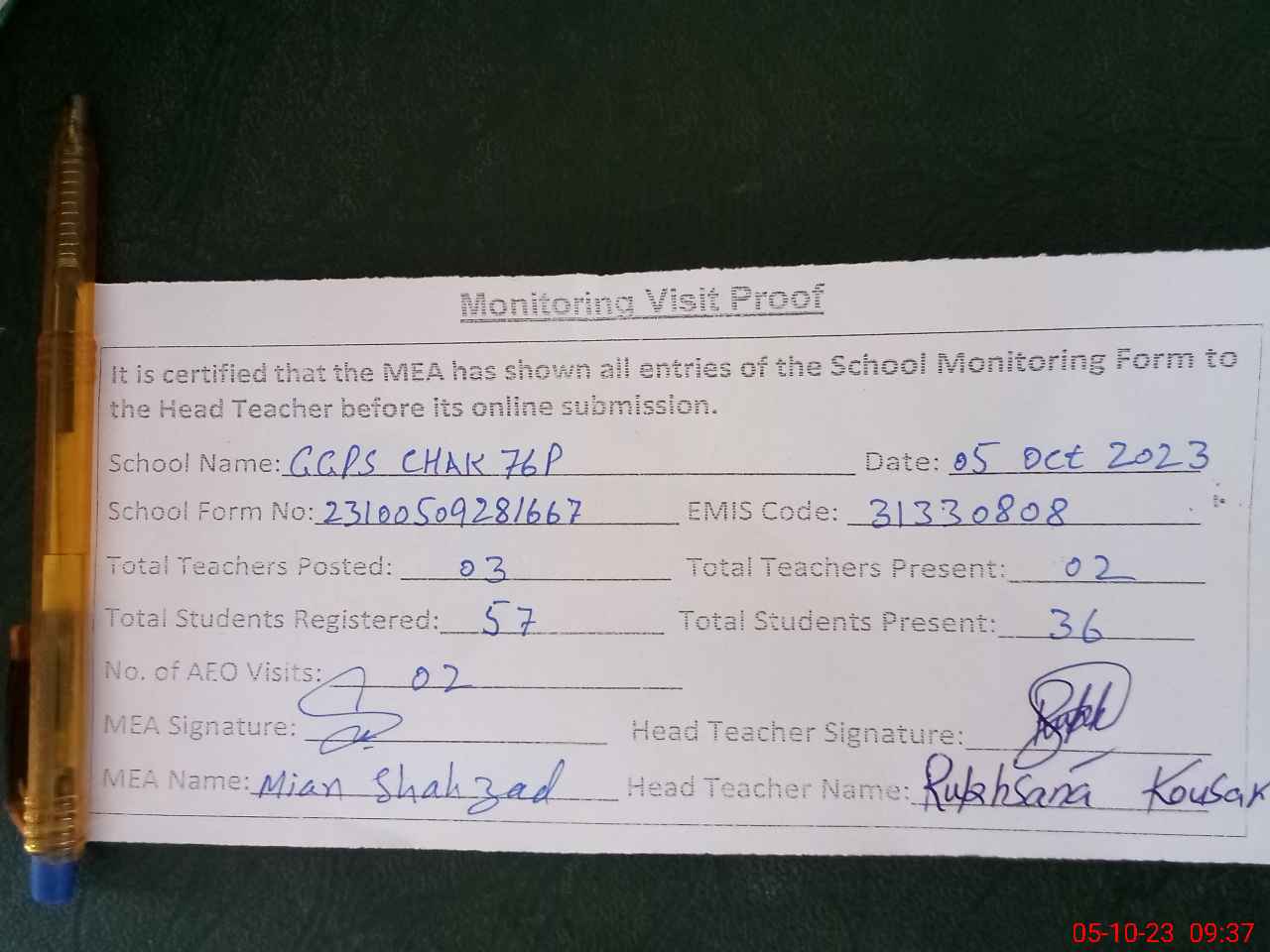 | Monitoring Date: 05-10-2023 | Start Time: 05-10-2023 09:03 AM | End Time: 05-10-2023 09:39 AM | Name of MEA: Sh**** Ah**** | |
