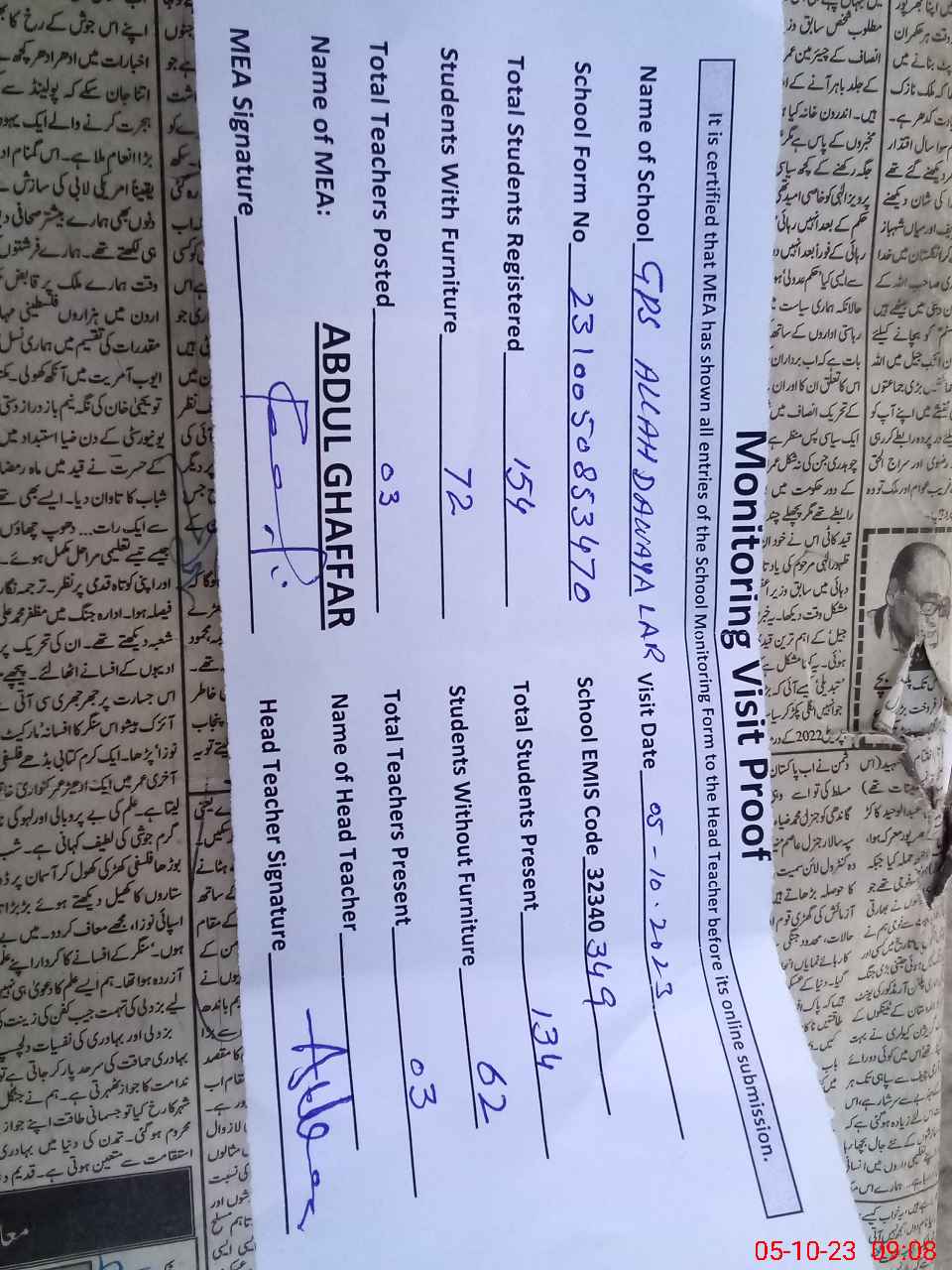 | EMIS Code: 32340349 | Name of School: GPS ALLAH DAWAYA LAR | |||