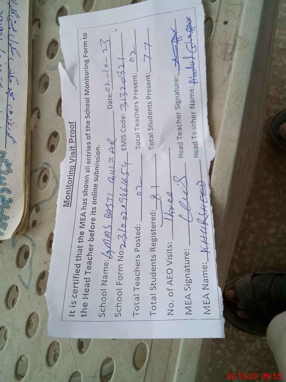 | Attendance Register | Head Teacher | MEA with School | Visit Proof |