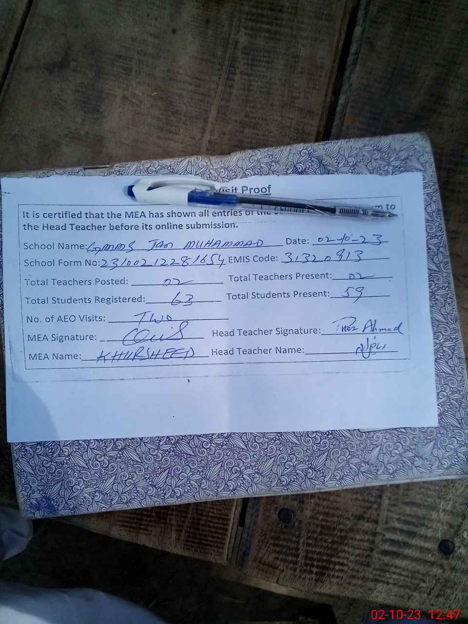 | Attendance Register | Head Teacher | MEA with School | Visit Proof |